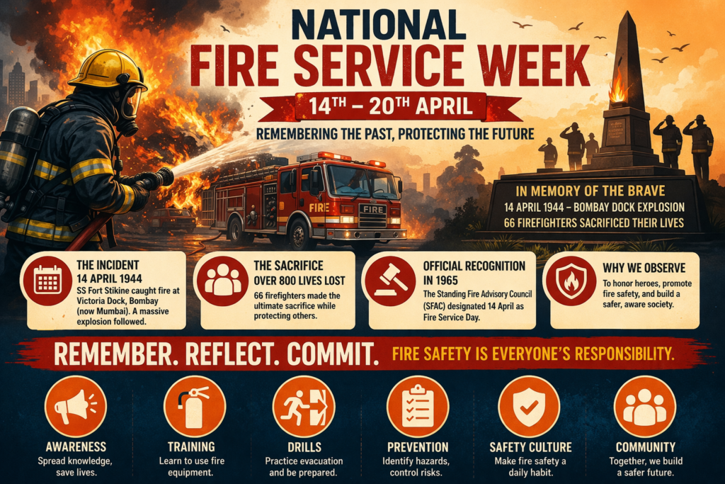National Fire Service Week, observed from 14th April to 20th April, is a reminder of the tragic Bombay Dock Explosion of 1944 and the sacrifice of 66 brave firefighters who lost their lives while protecting others. It also highlights the need for awareness, preparedness, and prevention.